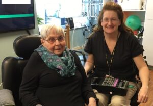 Bjurstrom participates in therapy to keep her stiffened joints moving, while her Pronto power wheelchair propels her around Homeland and on trips. The therapy team helped her acquire the donated chair and provided three weeks of training in its safe use.