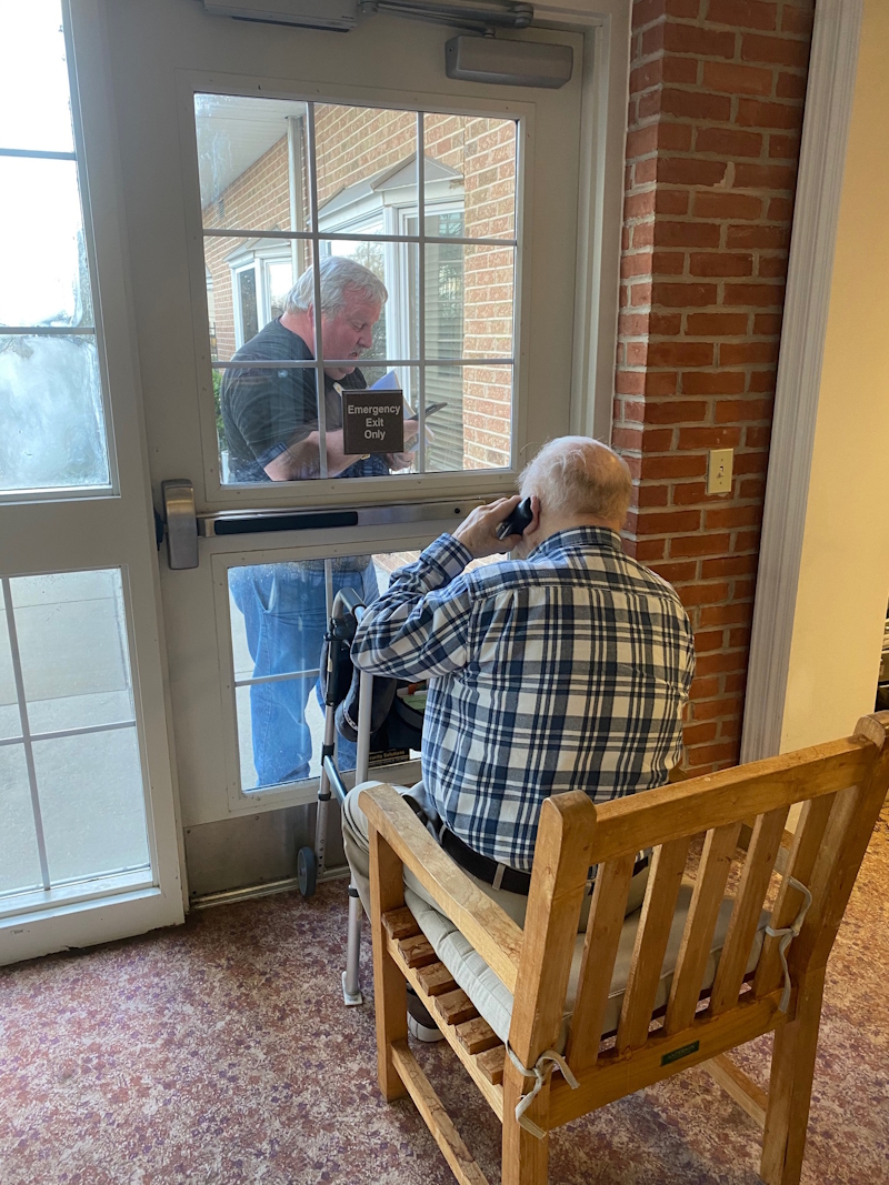 Some residents, like Betty, do better with window visits than virtual visits because they have a hard time seeing faces and following conversations on the small screen.