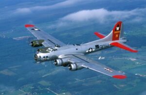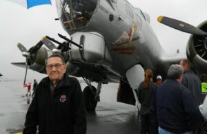 Seeing the plane parked on the tarmac – the B-17G-VE Aluminum Overcast — brought back memories for Bowers. The hefty B-17s, flying from England deep into Germany, flew in tight formation with nimble escort fighters that protected the bombers from air and ground attacks.