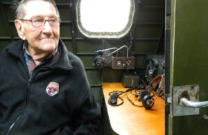 Though he uses a walker, Bowers eagerly climbed the steps to the side hatch and stepped inside the plane. He didn’t hesitate to maneuver across the ledge circling the ball turret and into the radio room. From there, he could see into a narrow catwalk and the bays holding the bombs. He smiled from ear to ear and laughed out loud.