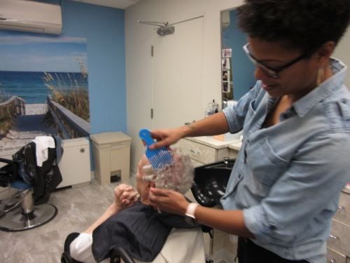The brightened colors and spiffed-up décor of Homeland’s newly refurbished Beauty Shop impressed resident Vicki Fox, who was getting her hair done.