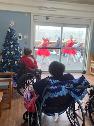 • Entertainment: With creativity and planning, residents have enjoyed some of their favorite musical entertainers via Zoom and a young dance troupe performed outside in multiple locations so residents from around the building could enjoy their presentation.
