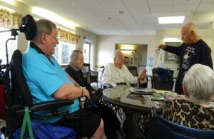 Welcome to Sports Talk at Homeland Center. Every other Thursday, residents and rehab patients gather near the beauty salon, just beside the eye-catching saltwater aquarium, for a discussion of sports topics led by Minkoff.